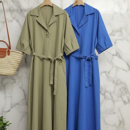 [신상오픈런]여성 나일론 허리 스트랩 투포켓 핀턱 롱 반팔 드레스 (36188741)