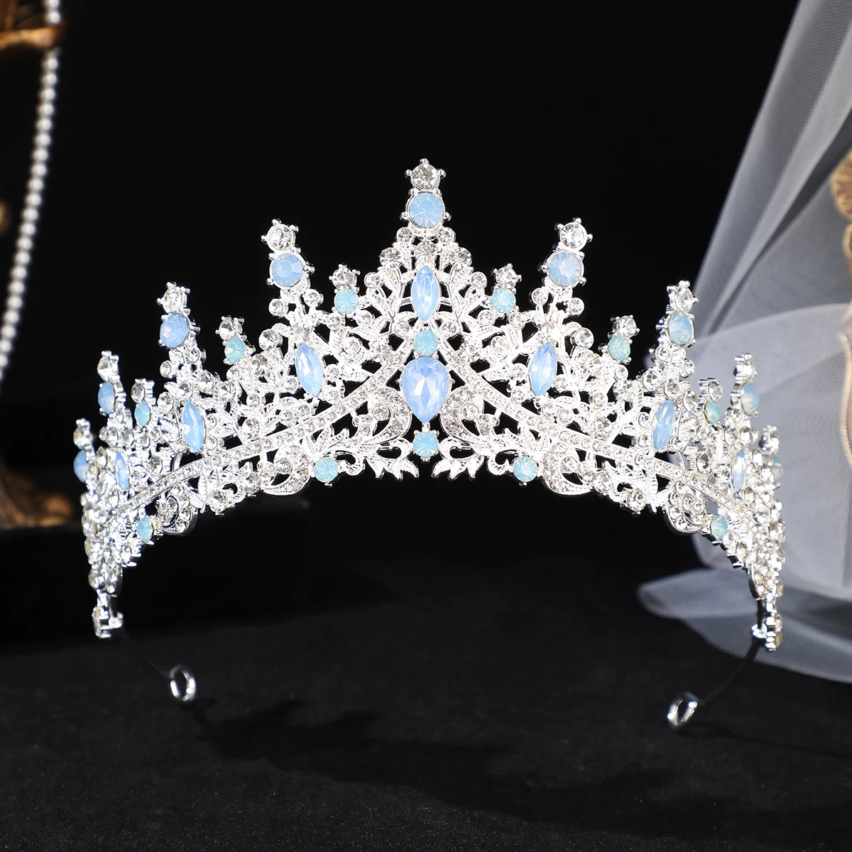 럭셔리 실버 골드 컬러 티아라와 크라운 여성 신부 블루 그린 단백질 크리스탈 라인 석 공주 웨딩 헤어 액세서리
