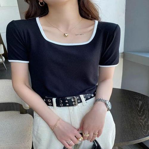 [에이치플러스몰]여성 4컬러 여름 스퀘어넥 배색 냉감 골지 반팔티셔츠
