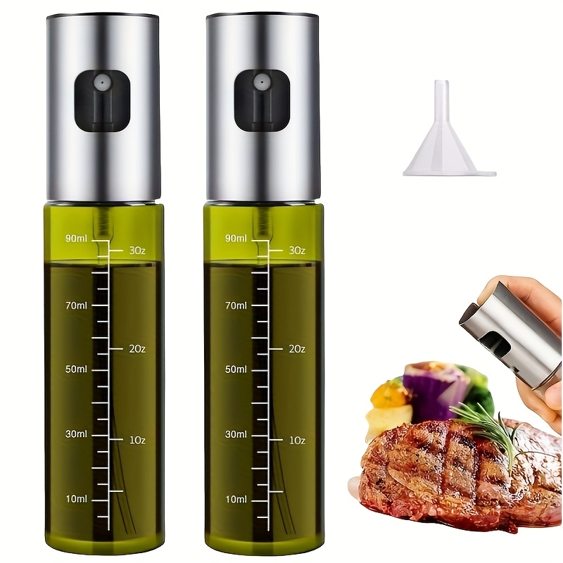 TEMU 2팩 올리브 오일 스프레이어 및 100ml 유리 디스펜서 병 - 공기 프라이어, 샐러드, 바베큐, 베이킹 및 로스팅용 식품 안전 비전기 디자인 - 투명한 컨테이너와 금속 캡, 주방 필수품, 올리브 오일 디스펜서, 베이킹 액세서리, 세련된 주방 용품, 금속 마감|에어프라이어