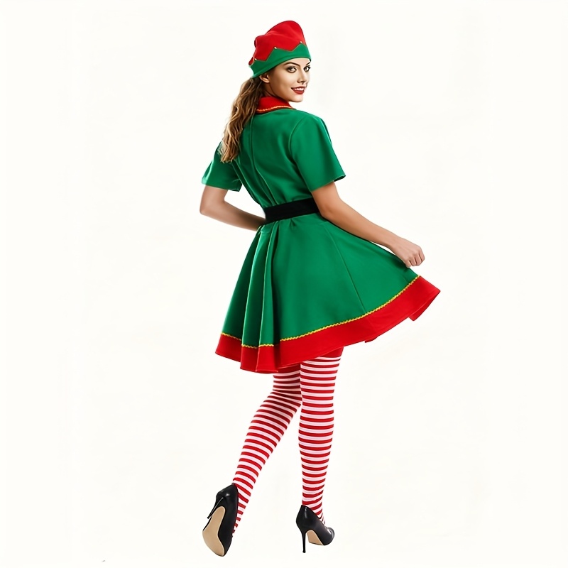 TEMU 4pcs 여성 크리스마스 엘프 코스튬 세트 (드레스, 모자 & 양말 포함) - 푸프 소매의 녹색 & 빨간색 엘프 의상, 빨간색 & 레깅스, 크리스마스 코스튬, 파티 복장, 장난기 넘치는 디자인, 튼튼한 원단, 코스프레 애호가