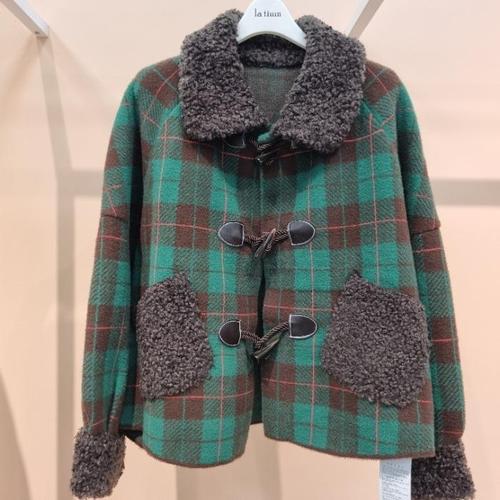 라티움 HC34 양털카라 떡복이단추 품편한 체크니트 짧은점퍼 T2543jk02