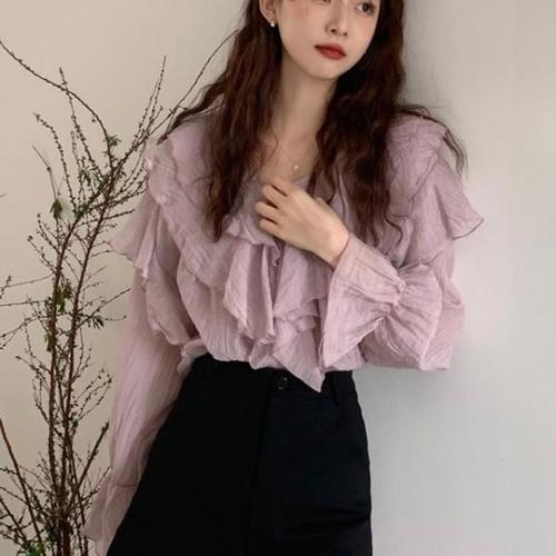 [허밍퍼플]여성용 2314 바바 이중 프릴 BL 빅사이즈 블라우스 단추 긴팔 긴소매 봄 가을 세련미 여성의류
