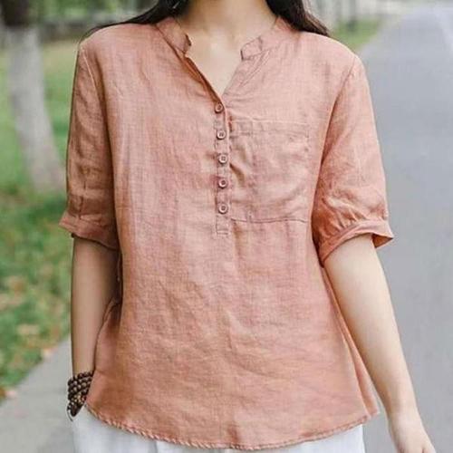 국산 여성 단추 라운드넥 인견 7부소매 블라우스 YF-WBL-20665-핑크