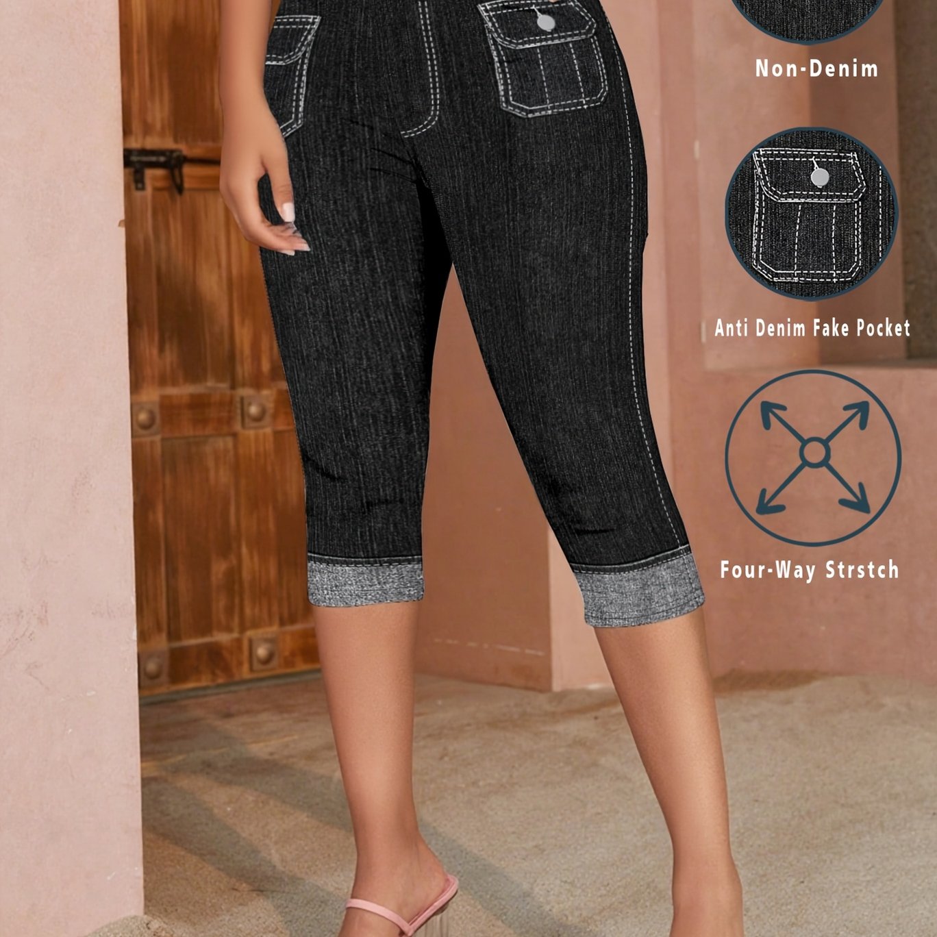 TEMU [프린트 레깅스 - 데님 원단 아님] 여성 패션 커프스 디자인 데님 스타일 효과 프린트 스키니 카프리 팬츠