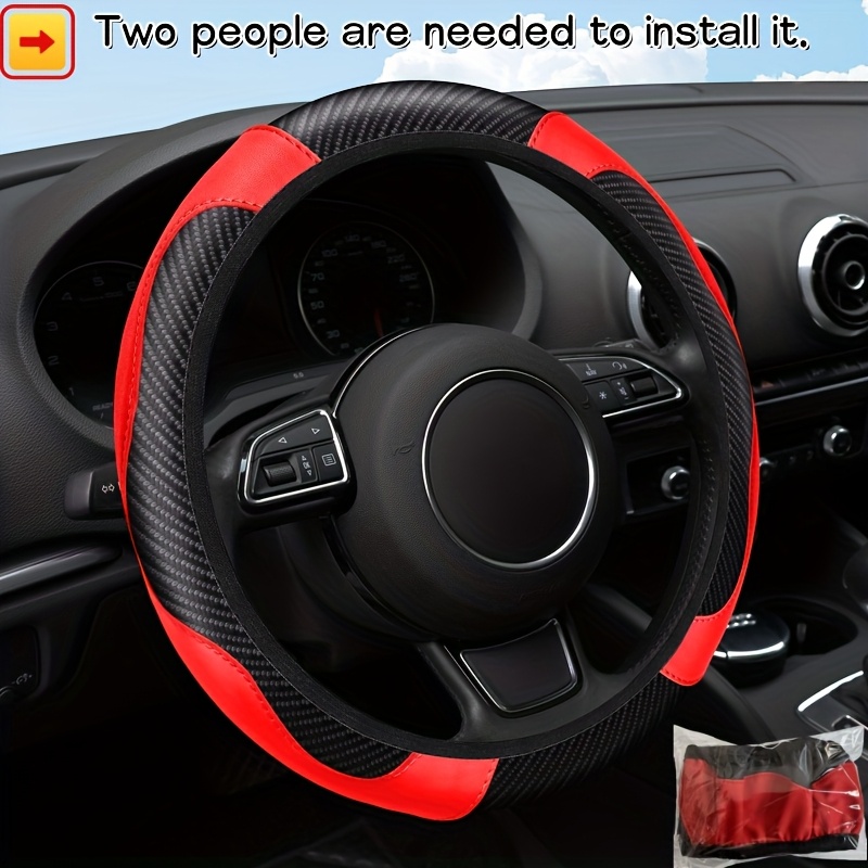 TEMU 사계절용 카본 파이버 텍스처 PU 가죽 스티어링 휠 커버 (내부 링 없음). 두 명이 설치 필요. -15인치. 통기성, 미끄럼 방지, 내마모성, 편안함, 내구성. 자동차 내부 액세서리