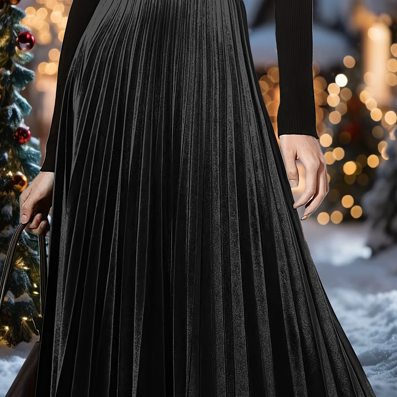TEMU 1개 우아한 플리츠 벨벳 스커트 - 여성용 - 폴리에스테르 95% 스판덱스 5% 니트 원단, 단색, 레귤러 핏, 휴가 스타일, 롱 길이, 가을/겨울 시즌, 폴리에스테르 안감