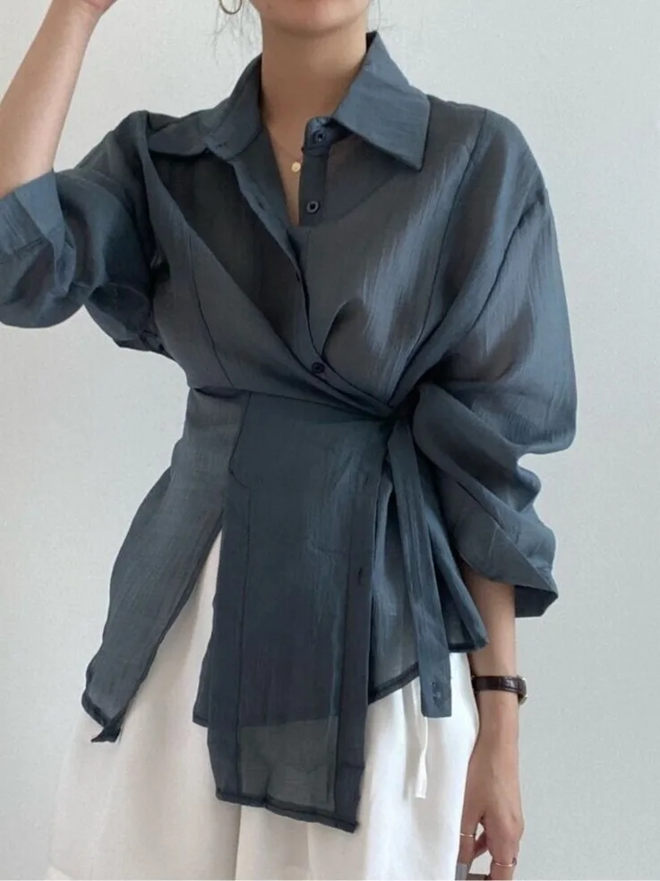 시크하고 심플한 우아함, 턴다운 칼라, 싱글 버튼, 비대칭 허리 조임, 얇은 긴팔 자외선 차단 셔츠 탑