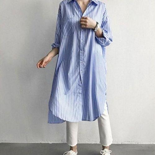 [에이치플러스몰]절개 가로줄 데일리룩 여성용 롱사이즈 드레스셔츠 우먼 베스트 티탑하절기 라운드티 하..