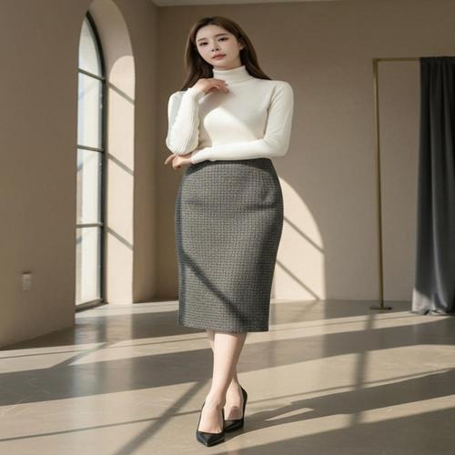여자 울치마 중간 겨울정장 격자 슬릿 스커트