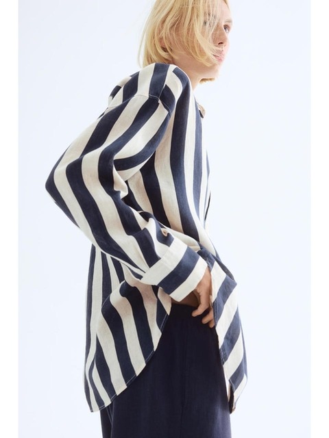 [에이치엔엠] 오버사이즈 리넨 셔츠 네이비 블루/스트라이프 1258631002