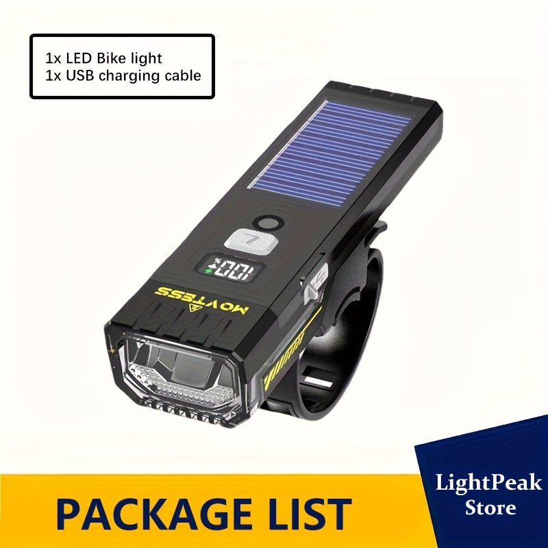 TEMU 1개 MACROCOSM 태양광/USB 충전식 자전거 라이트, 자동 켜기/끄기 기능, USB-LED 자전거 헤드라이트, 야간 라이딩용, 휴대용 전면 자전거 라이트, 경적 및 전원 디스플레이 포함 (자전거 호환)
