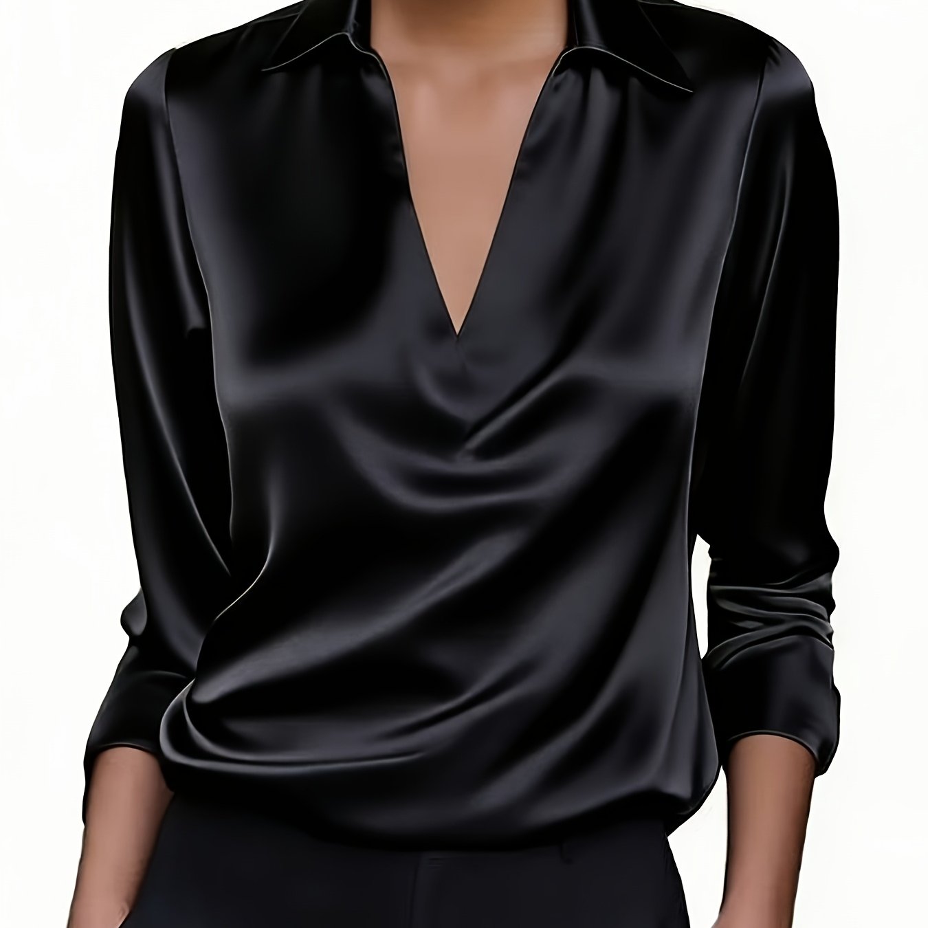 TEMU 우아한 새틴 브이넥 긴소매 여성 셔츠 - 부드러운 질감, 루즈핏, 단색, 봄, 여름, 가을용, 캐주얼부터 정장까지 활용 가능, 캐주얼 패션 상의, 브이넥 셔츠, 새틴 질감