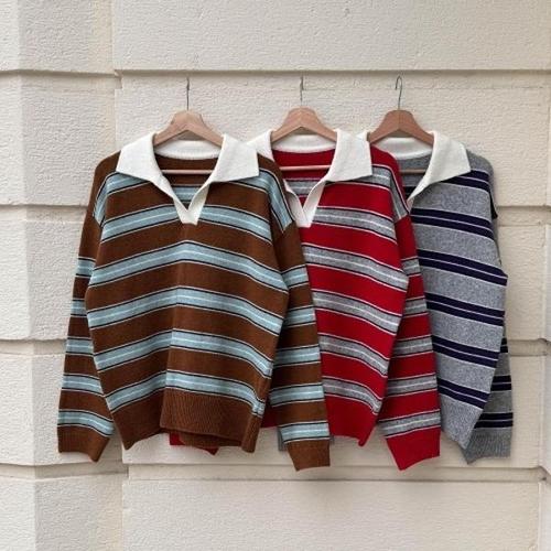 [다잇템][다잇템] 여성 FW 콘트라스트 줄무늬 긴팔티 카라넥 니트티_23961332_588872