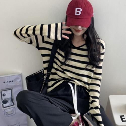 줄무늬 니트 티 여자 브이넥 데일리 기본 심플 WFKQCDF