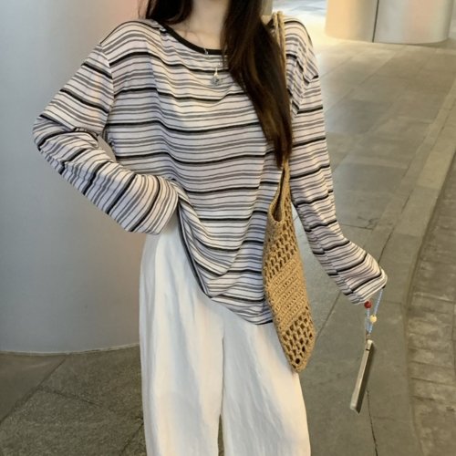 편안한 핏 여성 가을 긴팔 라운드넥 루즈 박스 티셔츠 루즈핏 오버핏 여자루즈핏 여성루즈핏 스트라이프티