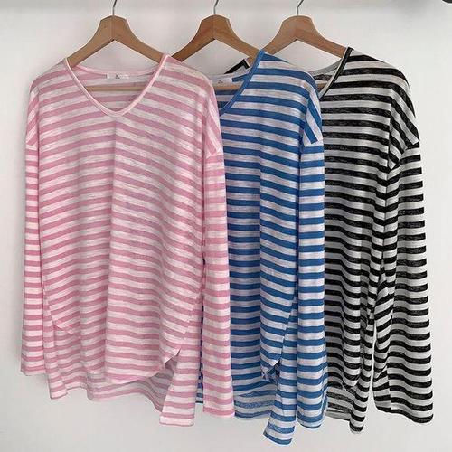 [다잇템_패션]여성 SS 줄무늬 V넥 트임 빅사이즈 티