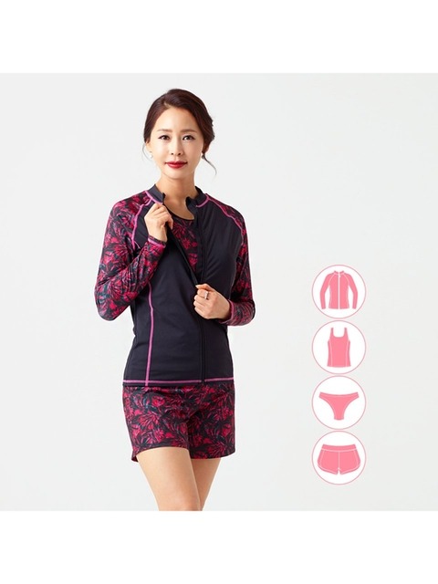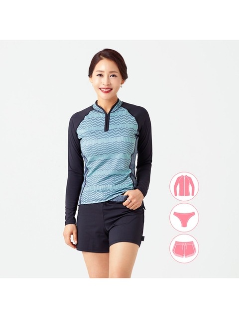 [베이직 엘르]베이직엘르 여성인 반집업 래쉬가드 3종세트 엄마래쉬가드 중년 실버수영복 BEL-T214K