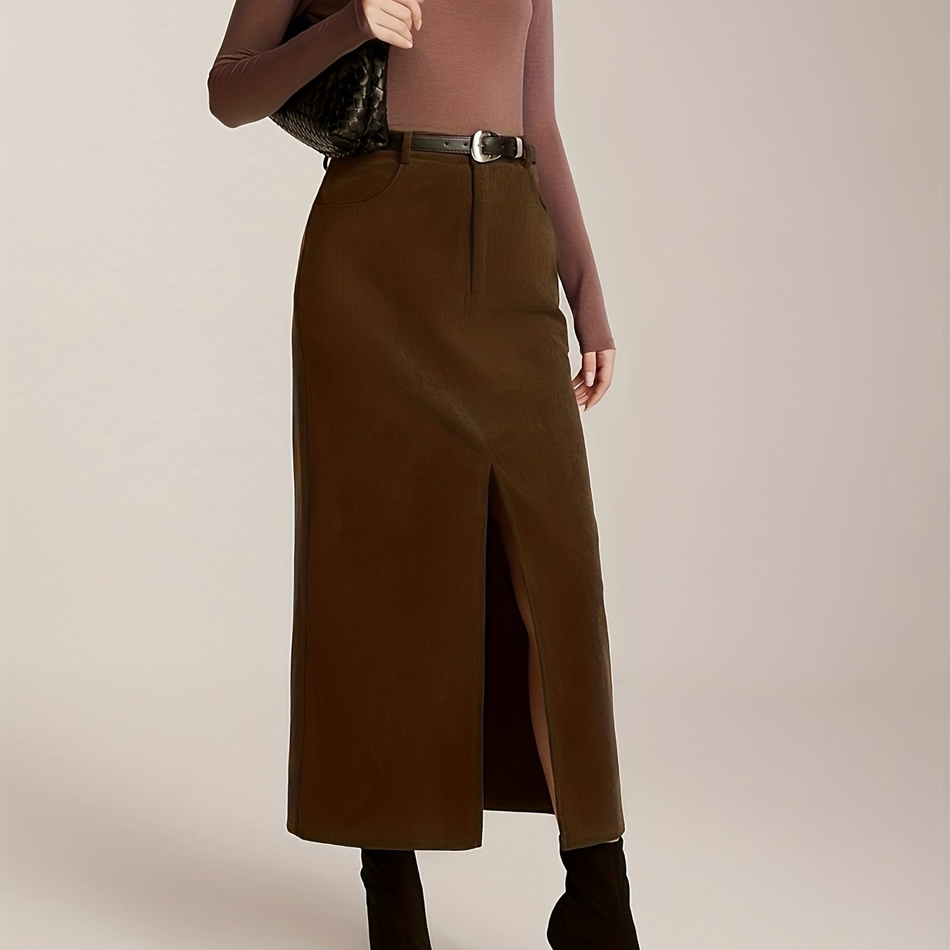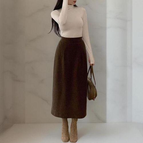 TEMU 여성용 빈티지 H라인 슬림핏 코듀로이 스커트 - 슬릿 디자인, 단색 중간 길이, 가을/겨울용, 주말 착용, 세탁기 사용 가능 (벨트 미포함)