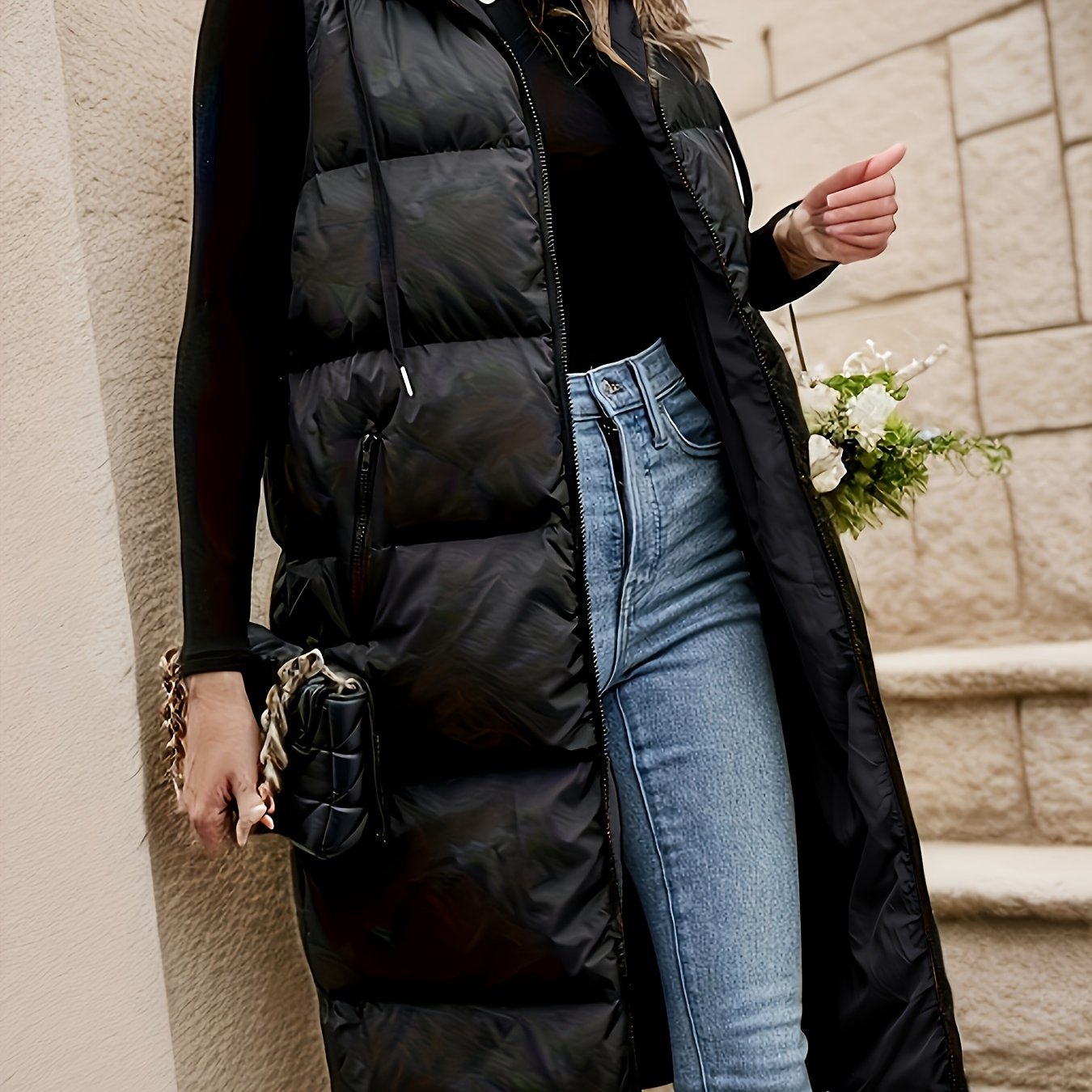 TEMU 여성용 우아한 프렌치 스타일 지퍼 후드 조끼 - 미디엄 길이 겨울 코트, 사선 포켓 & 조절 가능한 드로스트링, 솔리드 블랙 논스트레치 원단 가을&겨울 레이어링, 여성 겨울 코트