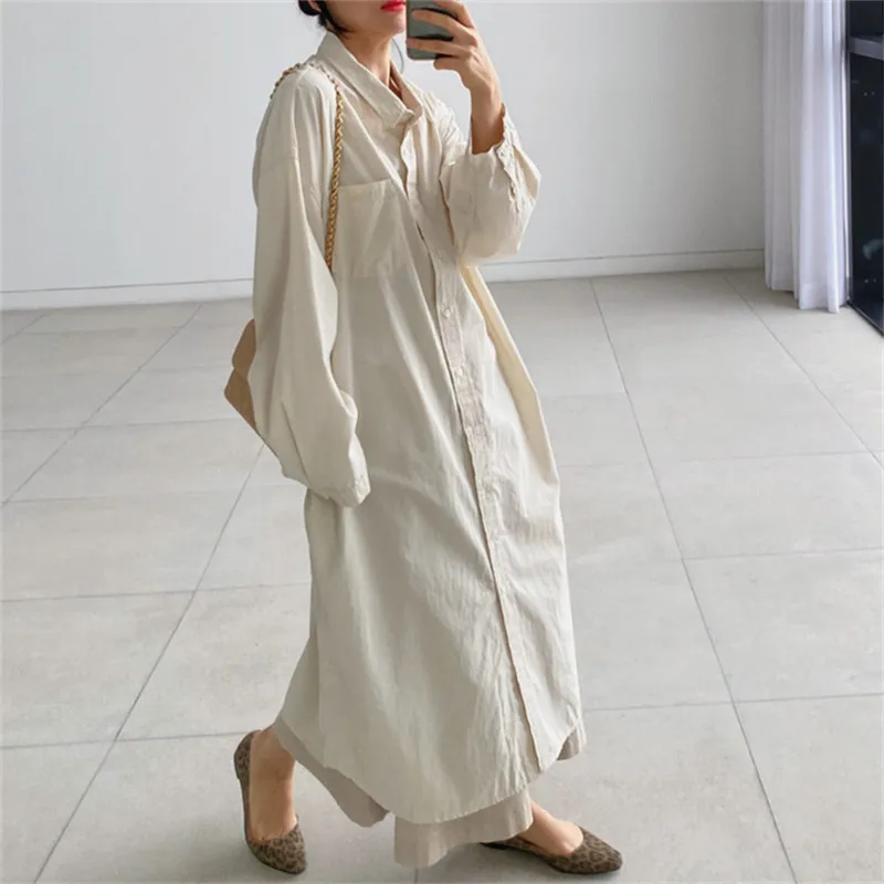 코튼 화이트 루즈 플러스 사이즈 셔츠 여성 캐주얼 트렌디 솔리드 컬러 턴 다운 칼라 발목 길이 셔츠 가디건 여성