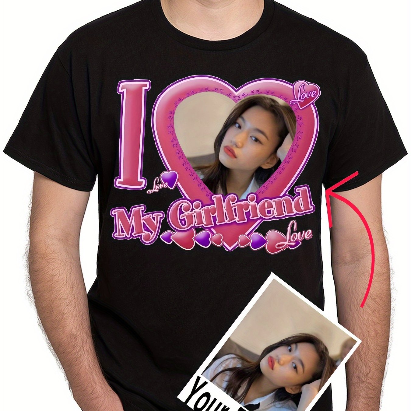 TEMU 남성용 커스텀 반팔 티셔츠 "내 여자친구를 사랑해" 커플 티셔츠 - 블랙 반팔 라운드넥 티셔츠, 핑크 회전 하트 패턴, 세탁기 사용 가능, 발렌타인데이 선물, 로맨틱 디자인, 기념일 선물, 편안한 핏, 남자친구 전용