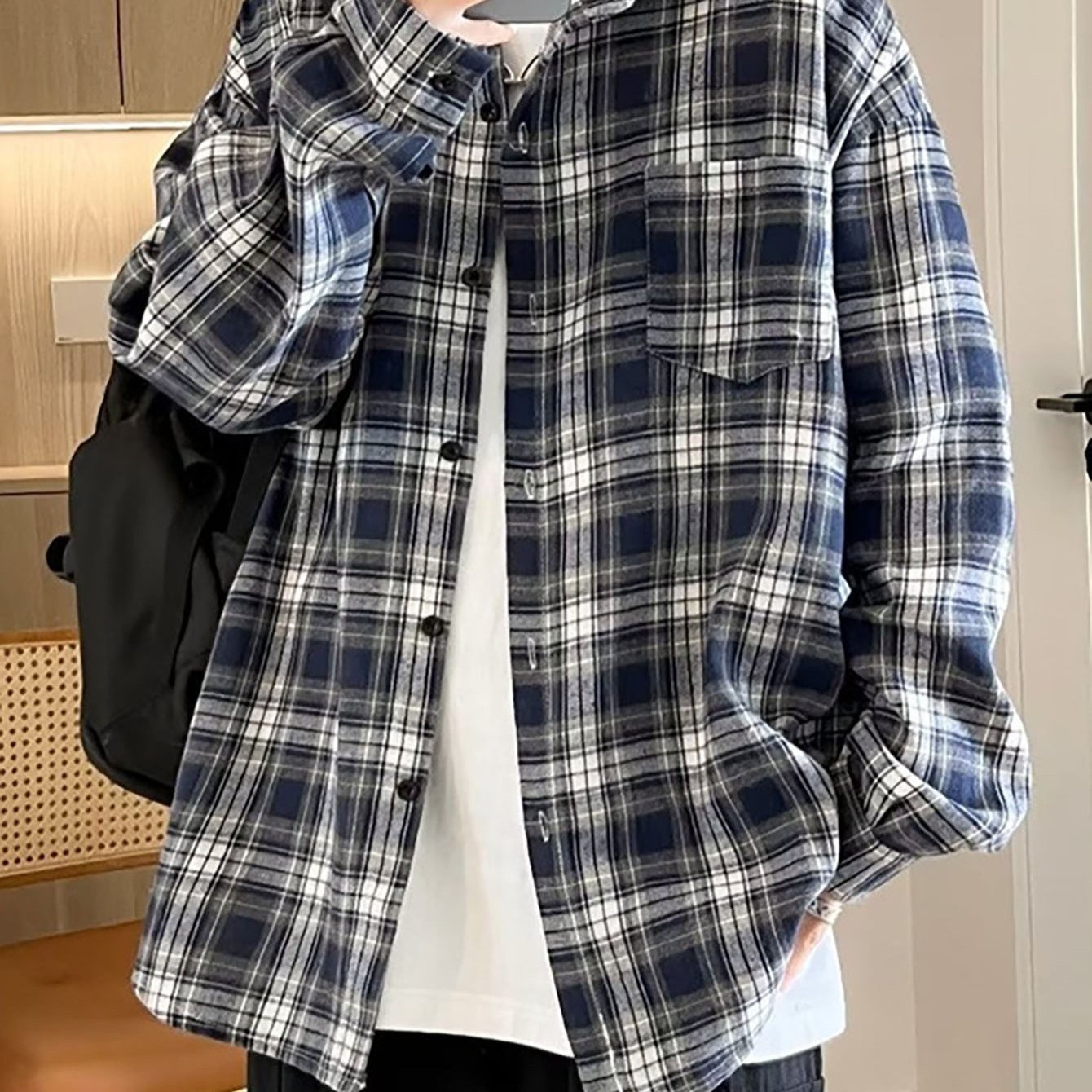 TEMU 비보뉴 빈티지 체크 남녀공용 오버핏 셔츠_가디건 겸용 봄철 라운드넥 데일리 아우터