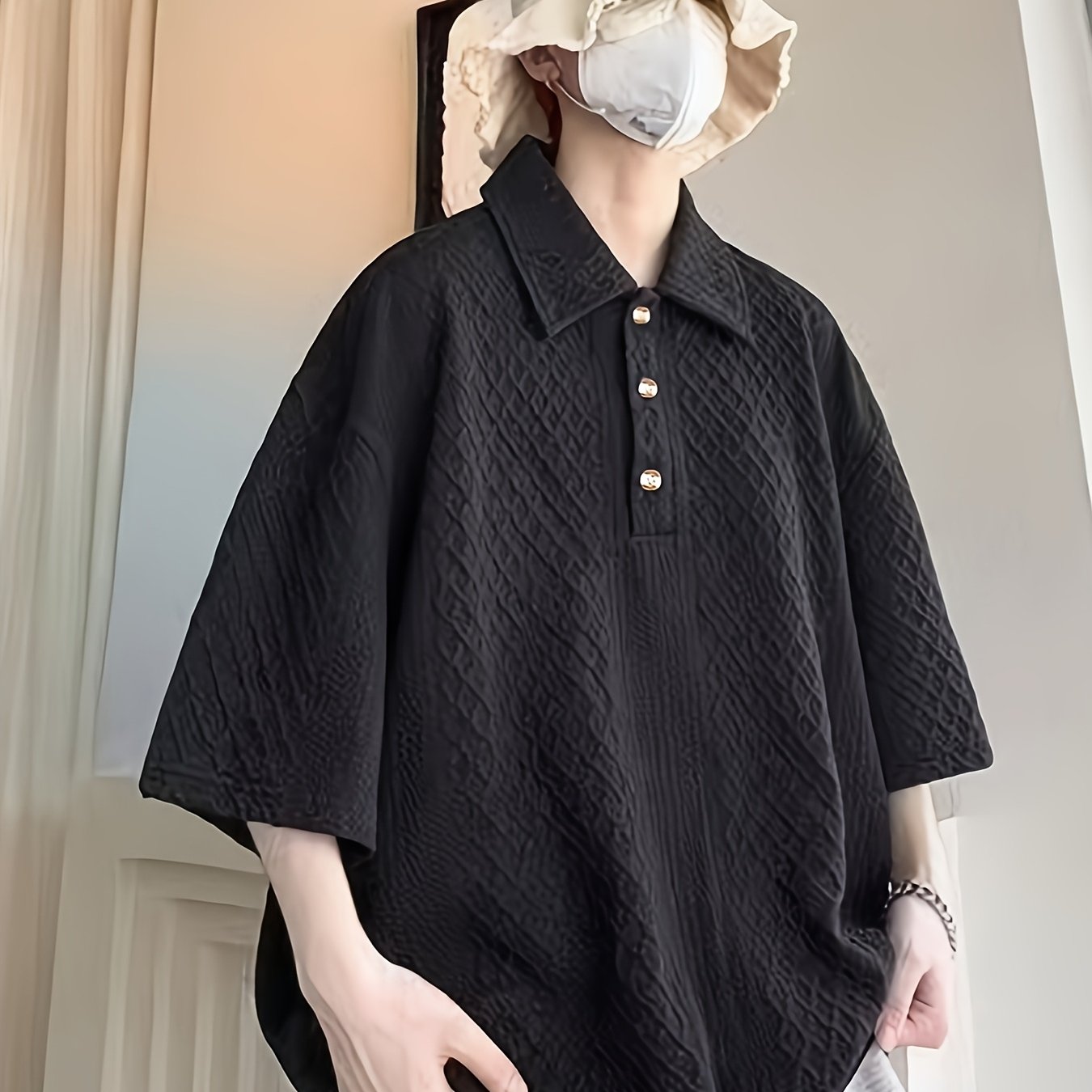 TEMU 남성 캐주얼 헨리 셔츠 - 기하학적 패턴 - 100% 폴리에스테르, 크루넥, 긴팔, 약간 늘어나는 원단, 열전사 프린트, 니트 - 버튼 디테일이 있는 봄/가을 컬렉션