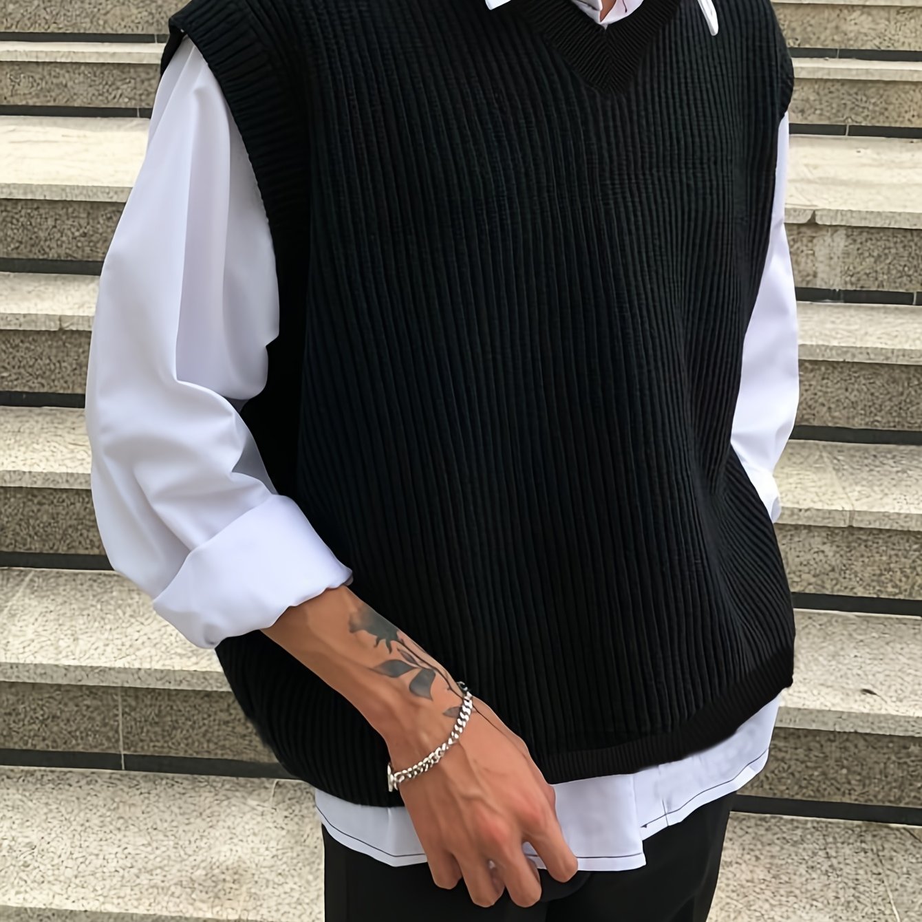 TEMU 남성용 솔리드 컬러 니트 조끼, 로프 캐주얼 풀오버 스웨터