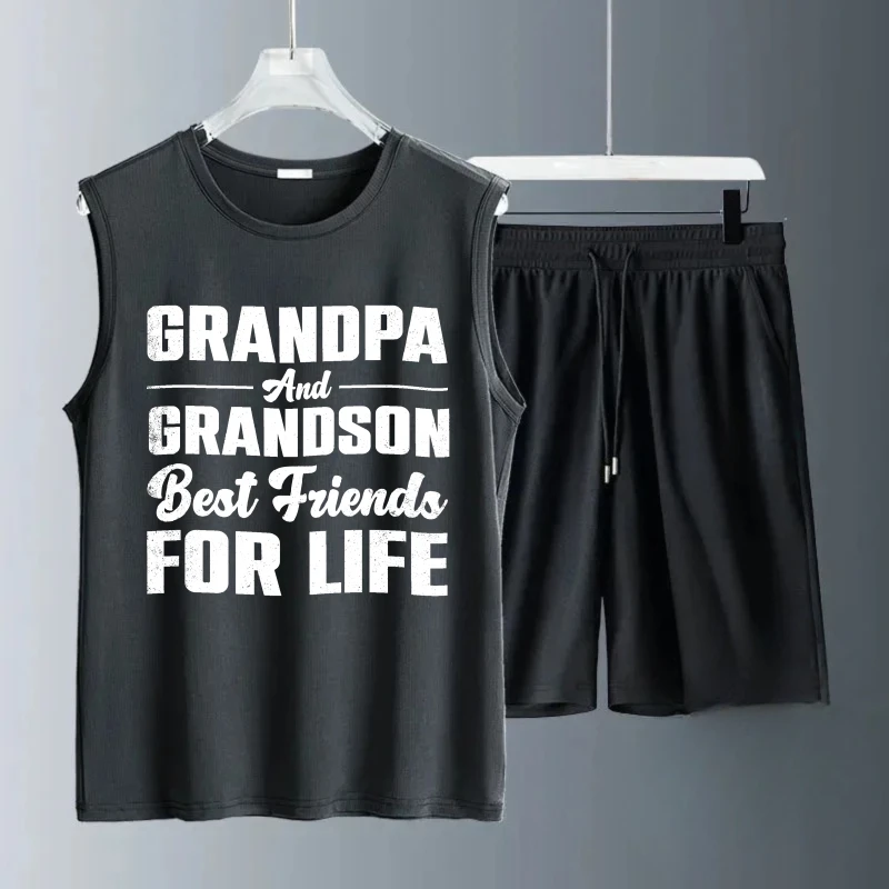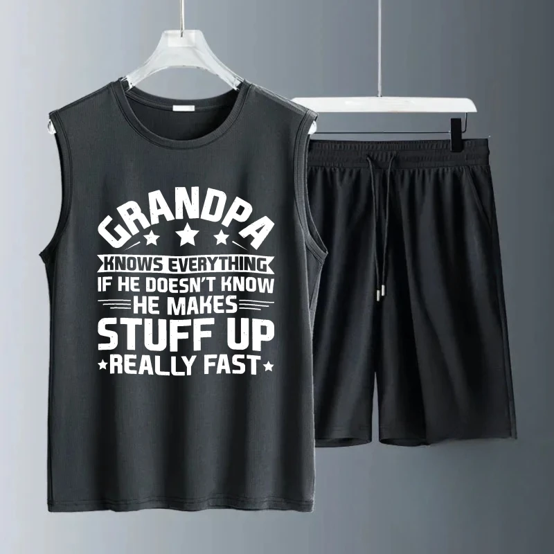 남성용 조끼 정장 여름 민소매 프린트 할아버지 손자 탱크탑 + 반바지 패션 정장 스포츠 투피스 빠른 건조 땀 흡수
