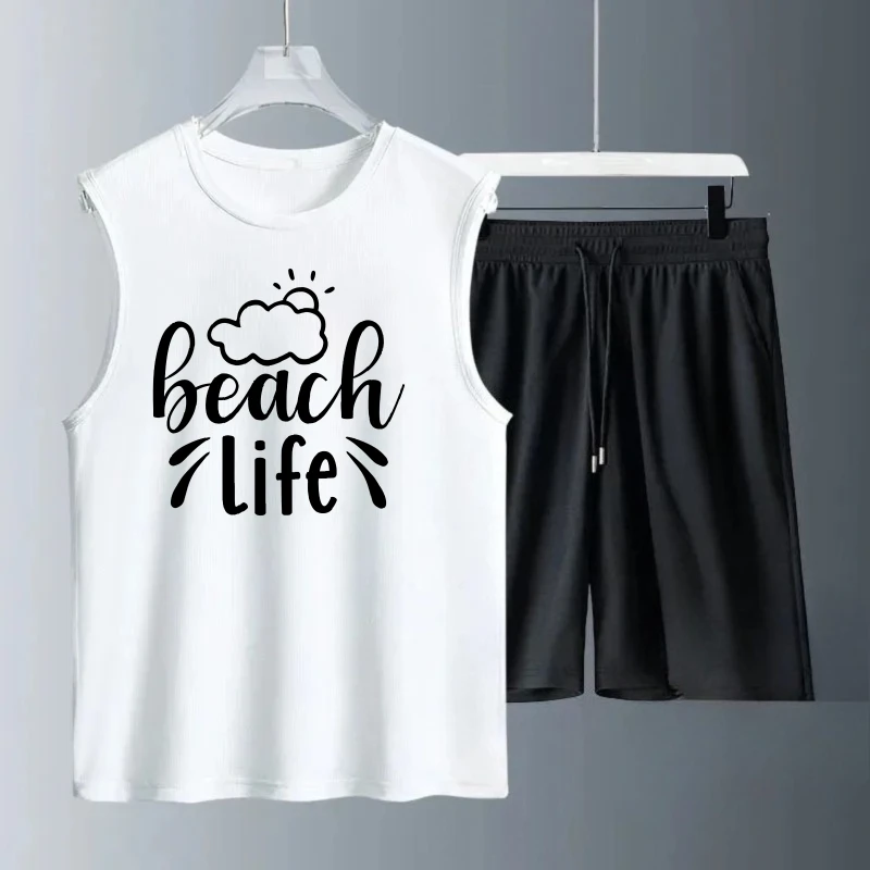 남성용 조끼 정장 여름 민소매 프린트 비치 라이프 탱크탑 + 반바지 트레이닝복 세트 남성 트랙슈트 빠른 건조