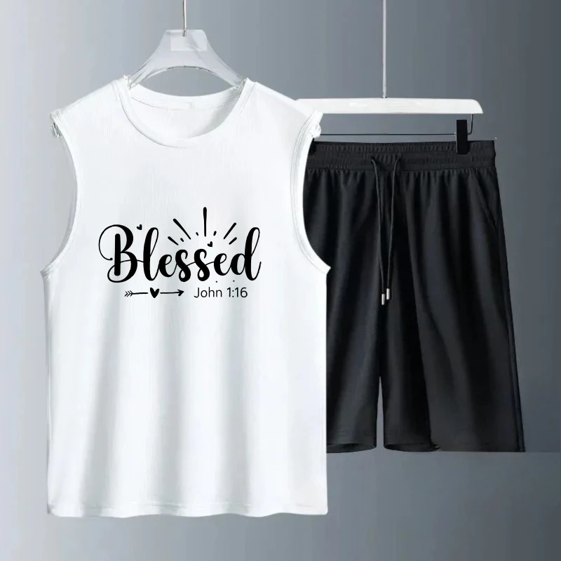 남성용 조끼 정장 여름 민소매 프린트 블레스드 존 탱크탑 + 반바지 패션 정장 스포츠 투피스 빠른 건조