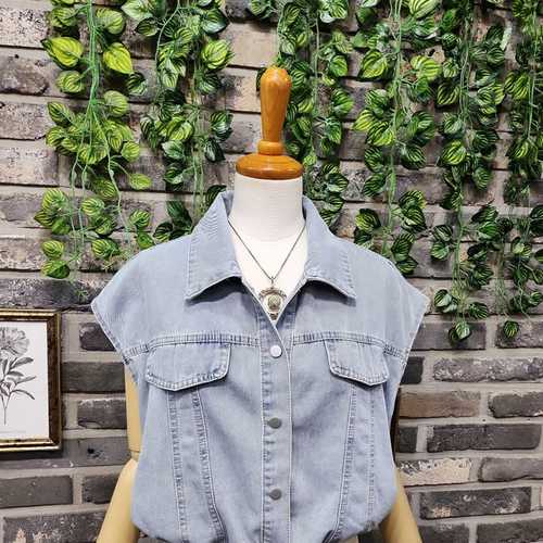 귀욤 루즈핏 밑단 스트링 카라 청 데님 조끼