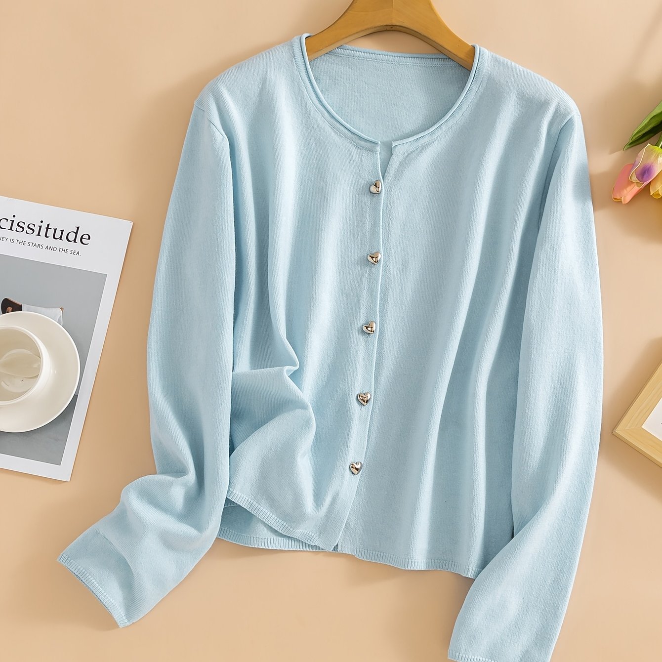 TEMU 여성용 경량 가디건, 스카이 블루 V넥, 긴소매, 버튼 앞면 클로저, 레귤러 핏, 약간의 스트레치 원단