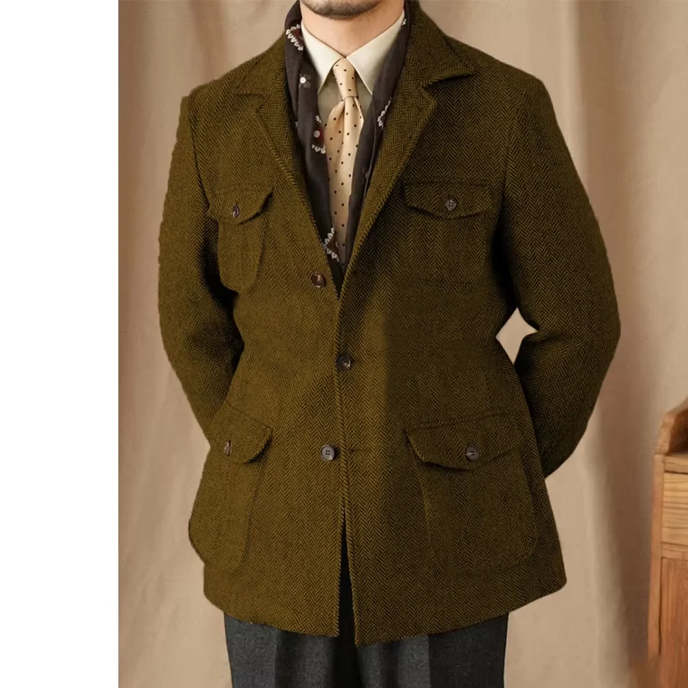 2025 남성 빈티지 헤링본 트위드 블레이저 영국산 울 혼방 더블 브레스티드 경량 캐주얼 스포츠 코트 포멀 재킷