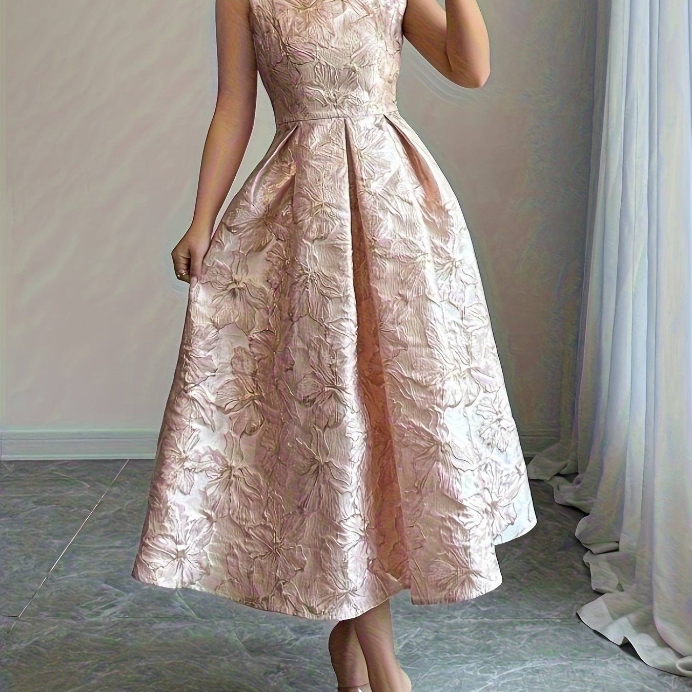 TEMU 여성용 우아한 라인 플로랄 자카드 드레스 - 민소매 라운드넥 미디 길이 이브닝 가운, 라인 실루엣, 세탁기 사용 가능한 웨딩 게스트 가운, 파티, 프롬, 세미포멀 이벤트용 - 논스트레치 원단 (S 사이즈 적합)