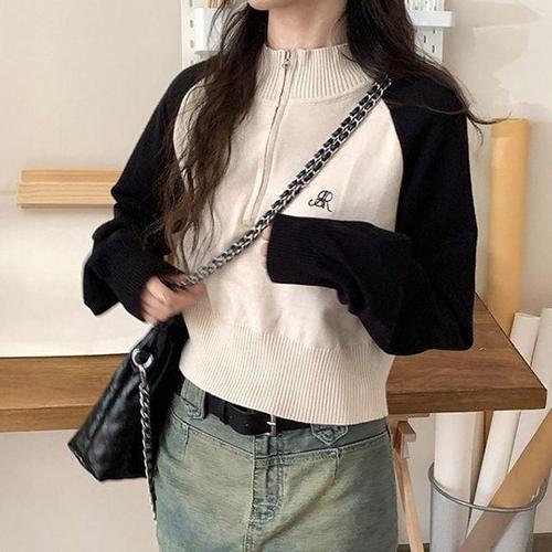 우먼 투톤 캐주얼 스웨터세미크롭 긴소매 반팔티 지퍼업 WFJIWVX