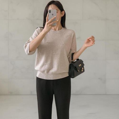 [다잇템]여성 반소매 출근 패션 진주 6색 리본 FW 니트