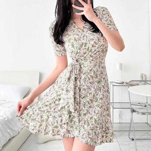 TEMU 부드럽고 독특한 그린 플로럴 A라인 비치 드레스, 짧은 퍼프 소매와 아름다운 허리 슬림핏 디자인