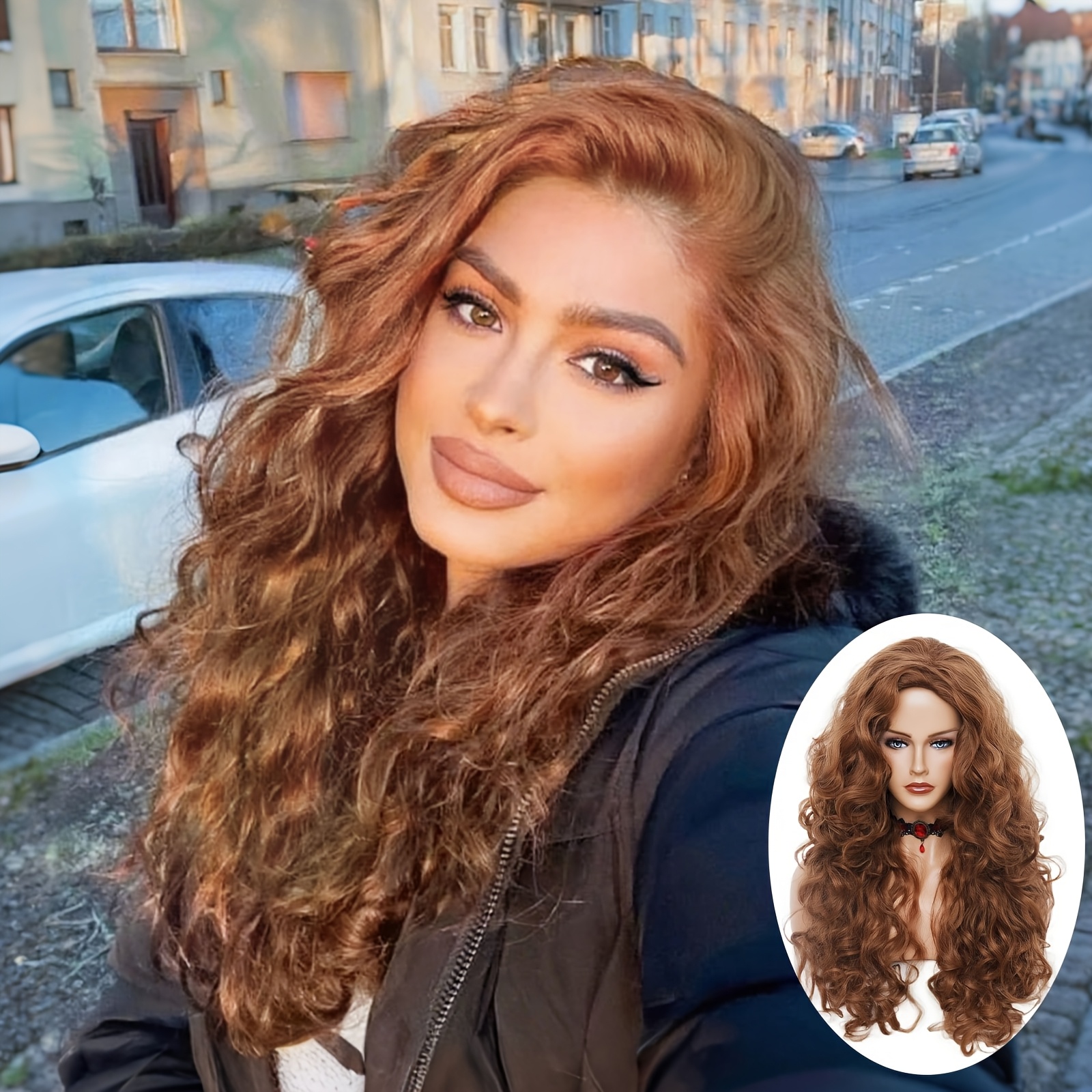 TEMU 여성용 롱 브라운 컬리 가발 - 웨이브 헤어 가발, 합성 섬유, 중앙 가르마, 코스프레 가발, 부드러운 웨이브 헤어, 데일리 파티 할로윈 코스튬용