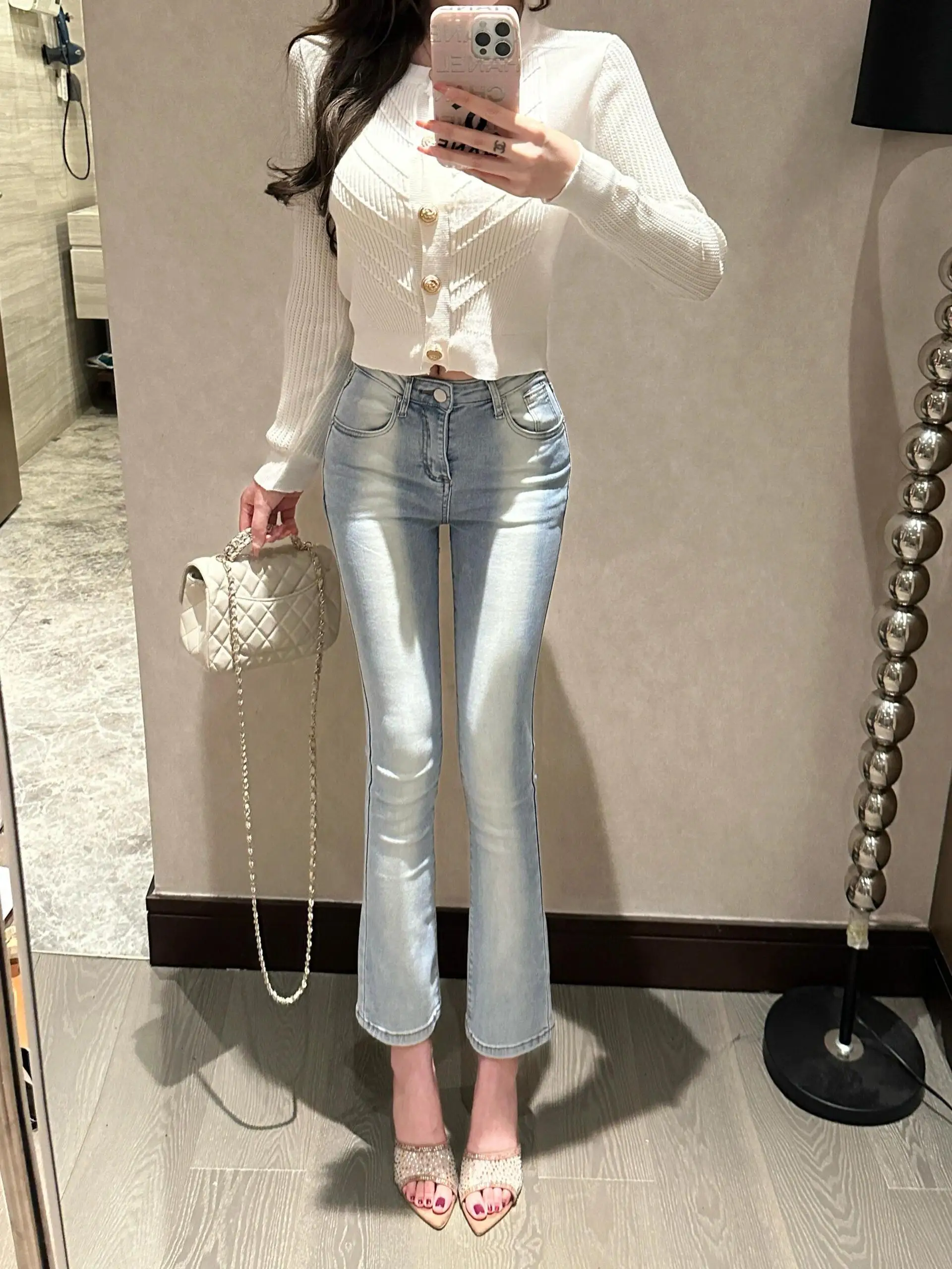 독특하고 아름다운 라이트 블루 그라데이션 하이 웨이스트 스트레이트 레그 청바지 통통한 힙 나인 포인트 팬츠 한국 스타일 슬리밍 레깅스