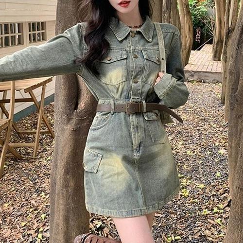 [엄지척]여성 허리 벨트 청 데님 셔츠 겸용 미니 원피스_19651305_667501
