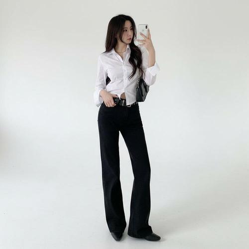 |KHP93C4|여성 하이웨이스트 블랙 와이드 부츠컷 청바지