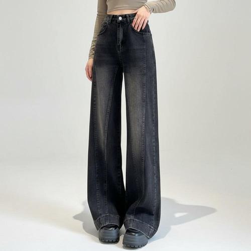 두꺼운 플리스 하이웨이스트 스트레이트 레그 청바지 여성용 봄 신상 큰 사이즈 루즈핏 와이드 레그 슬리밍 팬츠