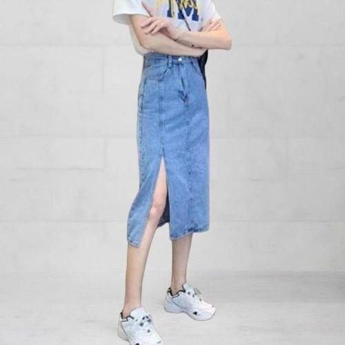 [다잇템]여성 무드 중청 중간 키치 슬릿 청스커트