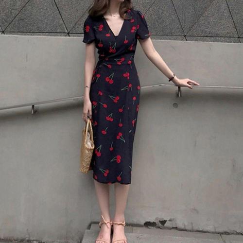 [굿쇼핑몰_의류]페미닌 브이넥 반팔 체리 롱 여리여리 원피스