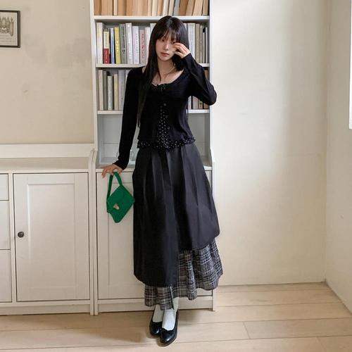 [옷자락]여자 데일리룩 편안한 레이어드 체크 롱스커트