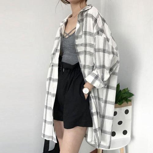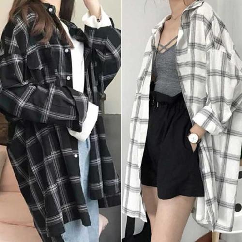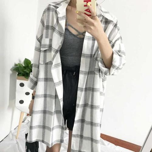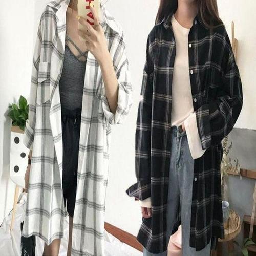 여자 클래식 기장 셔츠 롱 체크무늬 남방 루즈핏