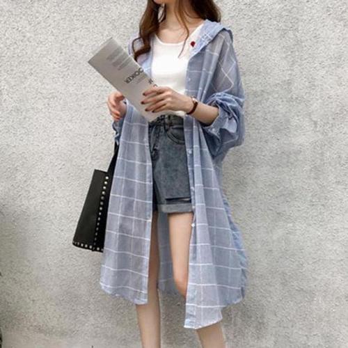 체크 후드 오버핏 남방 긴팔 여성 빅사이즈