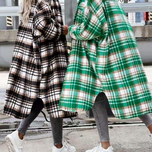 [옷자락]여성 키치 스타일 체크 포켓 카라넥 오버사이즈 롱 셔츠